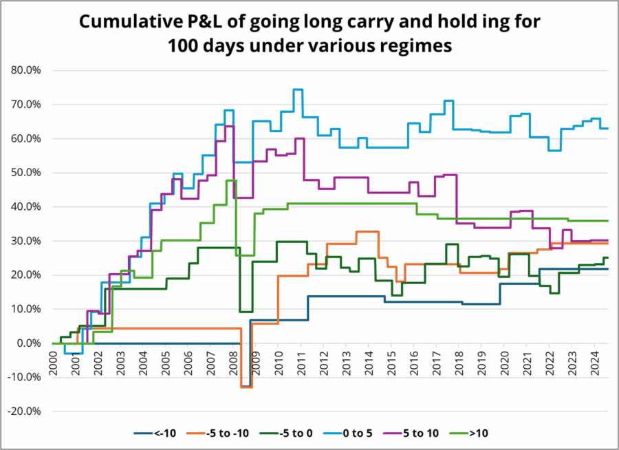 Current 100-day returns in the carry index are +7.1% and I looked back to see if the returns are autocorrelated, or if you’re better off fading the moves after such a big rally. The post-2010 result was completely useless because returns have been flat for so long. Obviously, going long carry, even when it was already working well, was a great strategy 2000 to 2007, because carry was trending. Since then, it hasn’t mattered whether carry was doing well or poorly, buying it mostly yielded a zero return.