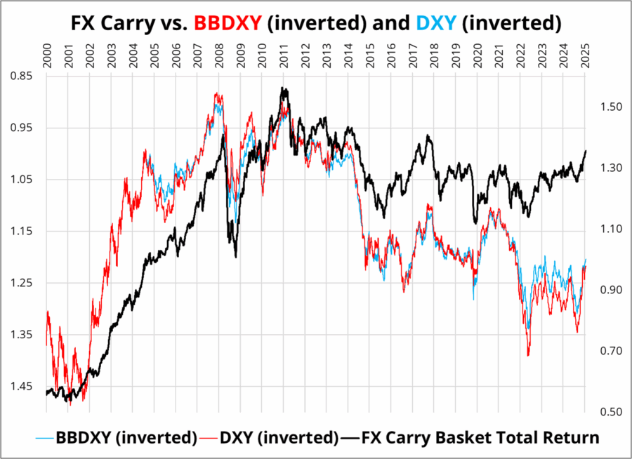 If you went long FX carry in 2010 and held until now, you’re flat. It seems weird that you have not been compensated for taking so much policy and emerging market political risk and so on, but anything that was not USA-centric was a pretty bad bet since the GFC as US megatech oligopolies gobbled up all the money throughout the 2010s. Post-COVID, US exceptionalism switched into an even higher gear due to AI; FX carry is also flat 2020 to now. FX carry is a bet on the BBDXY, and that index is up 30% since 2010 and thus the carry has pretty much perfectly offset USD appreciation. The much-touted Deutsche Bank FX Carry ETF that launched at $24 in late 2006 was demised at $25.41 in 2023. Craziness.