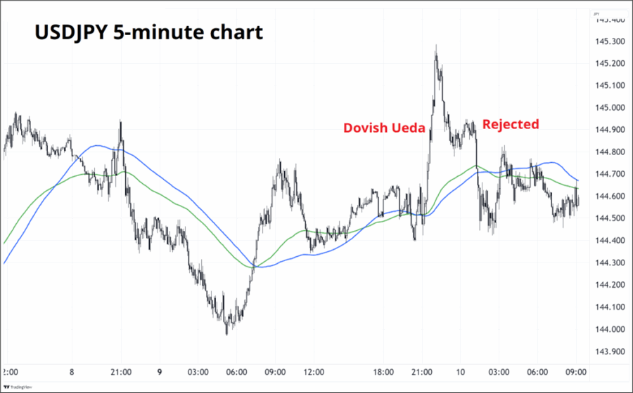 - Last night: BOJ’s Ueda Says Inflation Is Still Below Target but USDJPY rejects another move above 145.
