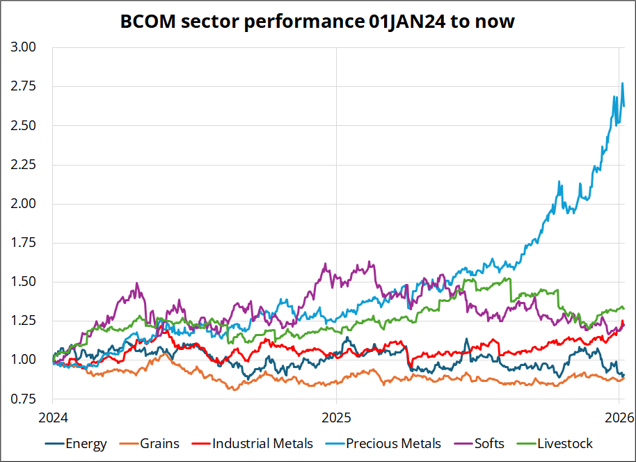 Here are the sector baskets within BCOM, if you’re curious. All rebased to 01JAN24 = 1.0.