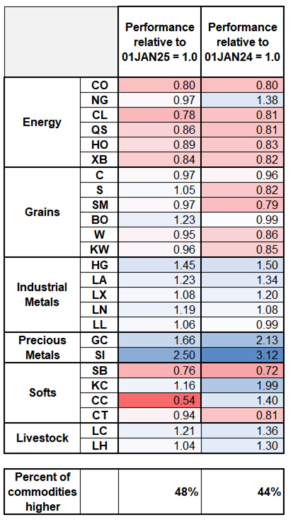 This is a significant reframing compared to what I had been thinking and compared to what you read in the financial media. Below I show the performance of the main commodities, indexed to 01JAN24 and 01JAN25.