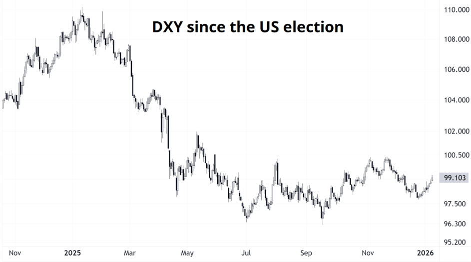 AUDUSD 2023 to 2025 is the most disappointing three-year run for a currency pair I can remember. AUDUSD, like bonds, has been in a moribund range. The market has come into 2026 guns blazing long AUD, but it’s not working very well so far. The USD has rallied a bit in the face of speculators who generally came into the year short dollars.