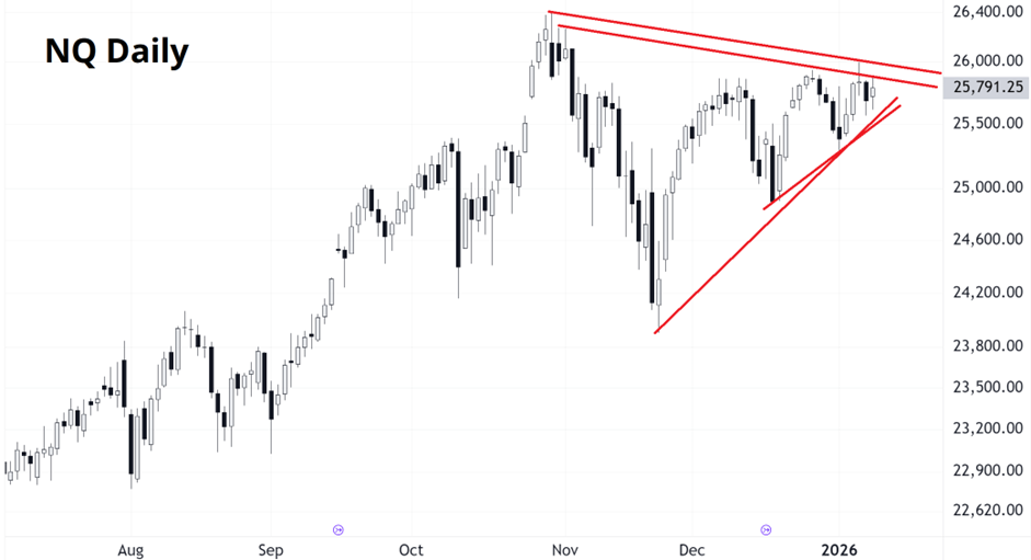 With less universal excitement about AI right now, the NASDAQ has failed to make a new all-time high still and that bears watching. We’ve got ourselves a narrowing triangle bounded by 25500/26000 in NQ, so whether you’re bullish or bearish, you will probably know if you’re right or wrong quite soon.