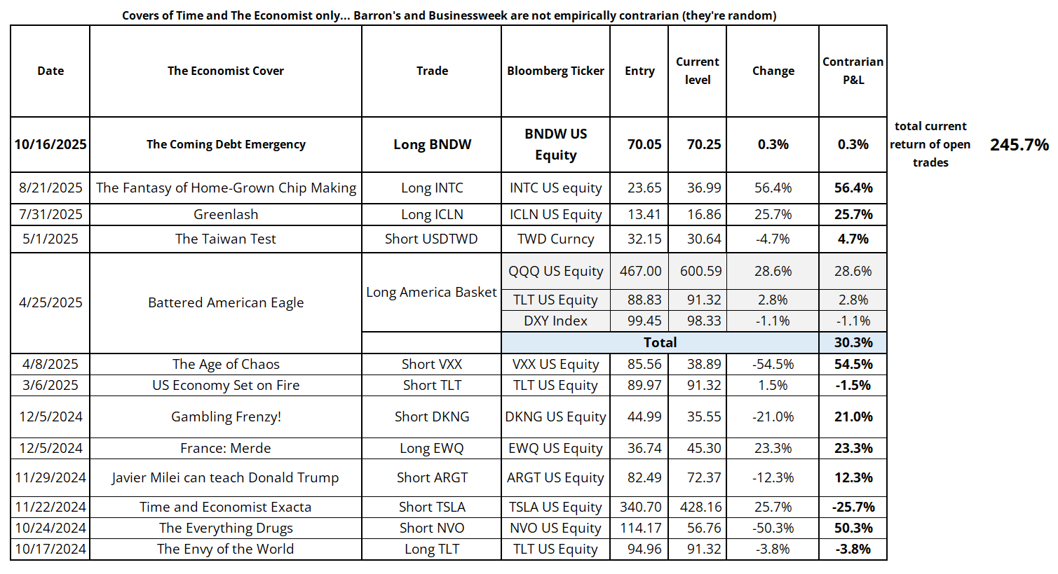 Below I show the updated trade tracker for the past twelve months. Big reversal in ARGT and huge rally in INTC both helped. If you are unfamiliar with The Economist as a reverse indicator, please see here: