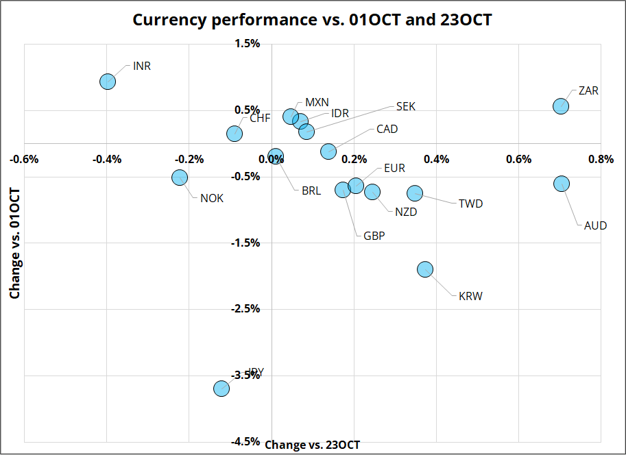 Meanwhile, gold and silver continue their momo unwinds, and FX is pretty quiet. You can see a mild beta to global trade and equities in the overnight price action as AUD outperforms and JPY and CHF do not. Here are the changes in the majors vs. October 1 and vs. last Thursday’s close. You can see if you look at the y-axis that almost all the blue dots fall in a -1%/+1% range, indicating that things have not moved much since the start of October. Only JPY and KRW have moved by more than 1% (both weaker). You can also see that ZAR and AUD have outperformed since last Thursday, while INR has struggled, and everything else is close to unchanged. Funny that ZAR and AUD, which used to be the most gold-sensitive currencies, are strongest even as gold returns toward Earth.