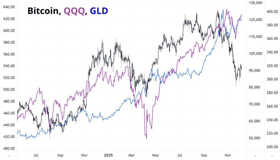 Bitcoin often decouples from risky assets in one direction or the other, but it always comes back home. This time, the divergence between BTC, QQQ, and GLD has been more prolonged than usual as there is no marginal buyer of crypto and still plenty of marginal sellers.