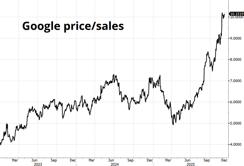 As Steen Jakobsen put it: The AI Capex trade was a long only trade and now it’s a long/short trade. That said, Oracle CDS have stalled and its stock price has rebounded smartly (so has CRWV) so even the wobbliest pillars of the AI trade have stabilized. Meanwhile, Google has been unanimously crowned as the winner of the AI war, a full 180 from when they were deemed to be the most likely to lose in 2023/2024 because Perplexity and others would surely crush their search business.