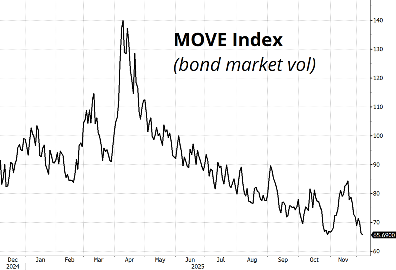 Yields are going absolutely nowhere as the data fog has not truly lifted and while there are some signs of labor market weakness in the U.S., the rest of the world looks less dovish. The market sells bonds every time the U.S. 10-year yield goes below 4.0%. There is no momentum. 10’s were 4.10% at the start of September and they’re 4.10% now. The resulting effect on bond market volatility is what you might expect…