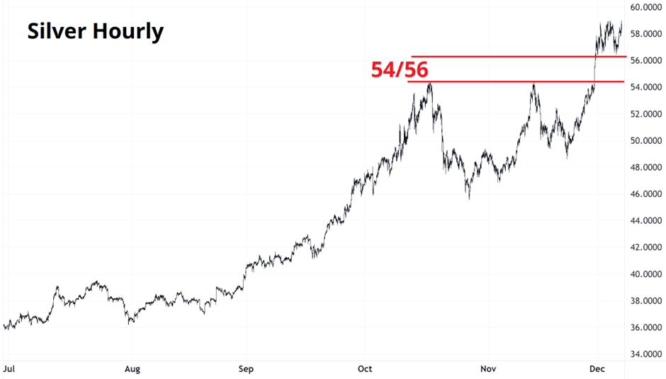 Silver has recovered strongly from the post-margin-hike selloff and is ripping to new all-time highs again. There isn’t much of a macro story anymore, it’s just retail demand and momentum trading and there are no natural sellers. Look at that huge gap from $54 up to $56. Wow. As long as silver is above $56, the bull trend is extremely strong, and you can use your imagination when thinking about possible price targets.