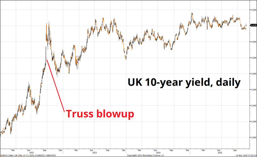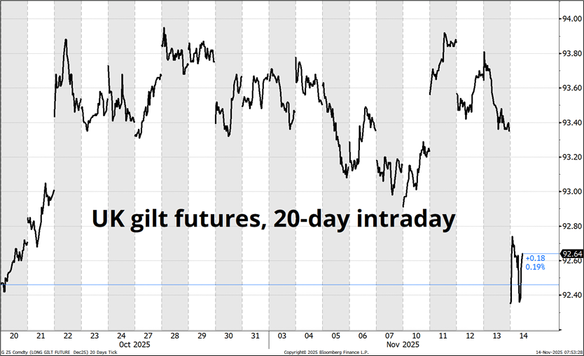 Note at far right: today’s moves vs. the size of the moves in 2022. I’ve been skeptical as to the importance of the 26NOV budget date because I felt like everything would be leaked beforehand, and that still seems to be the base case. Today’s moves show, however, there is maybe still some capacity for panic. Also: austerity is good for the fiscal situation, but bad for growth and so the market is seeing many bad branches on the tree of possibility.