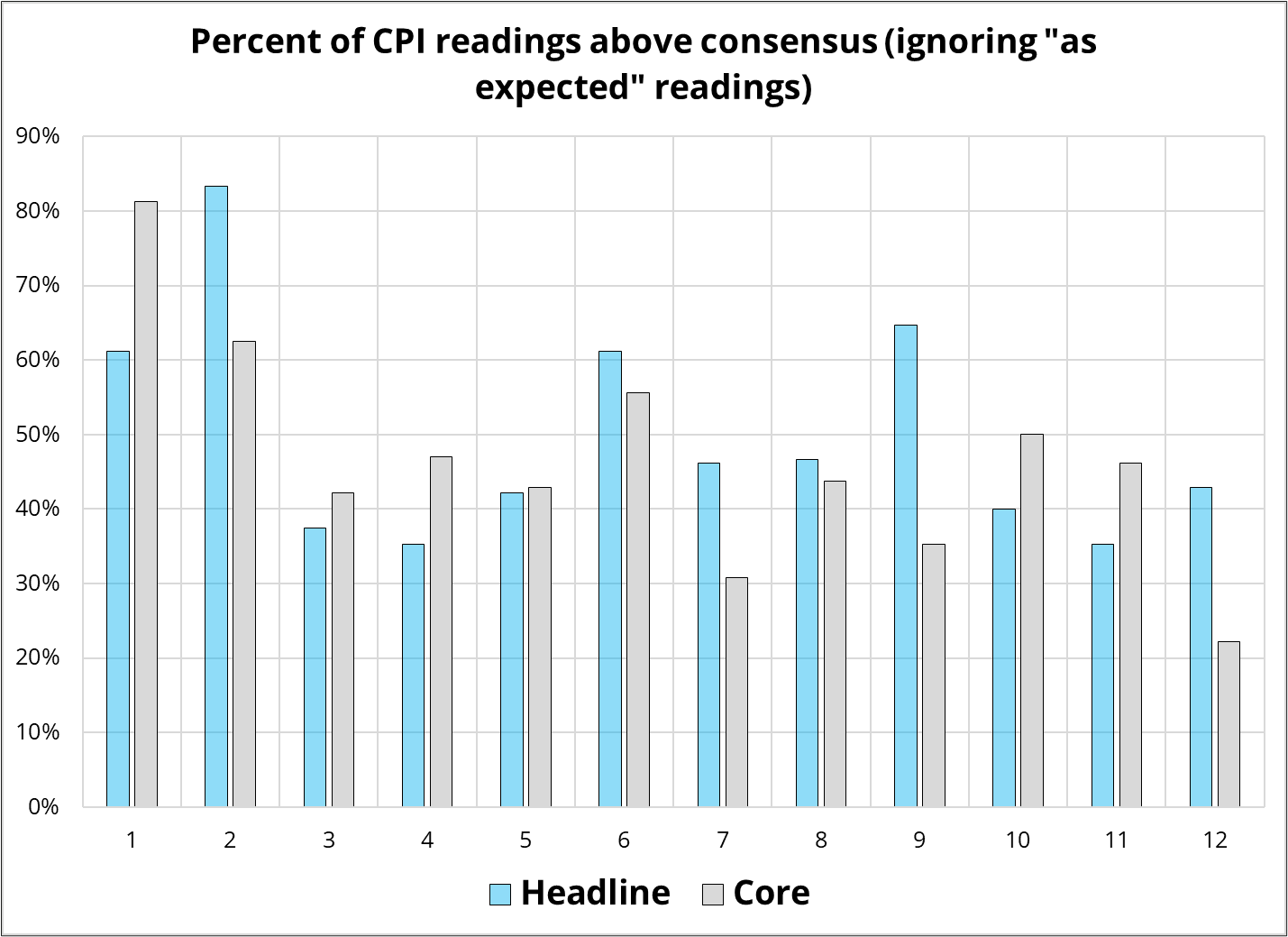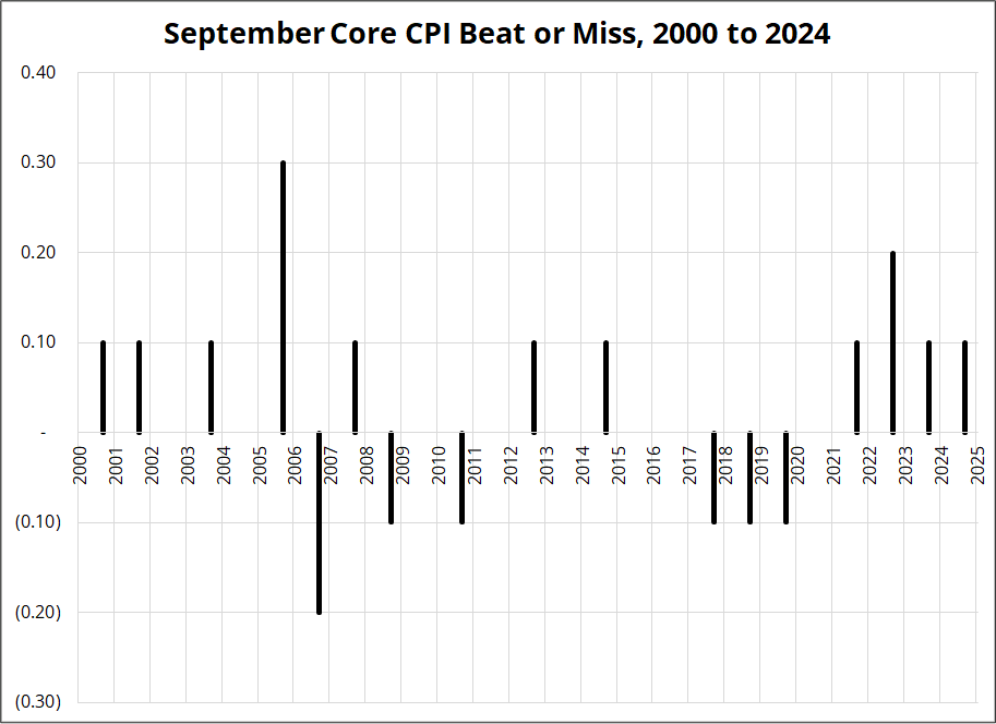 I suppose whoever is putting together CPI is worried about their job if the data shows strength, but I don’t think we can really factor that into any analysis. Here are the individual results for September Core over the past 24 years.
