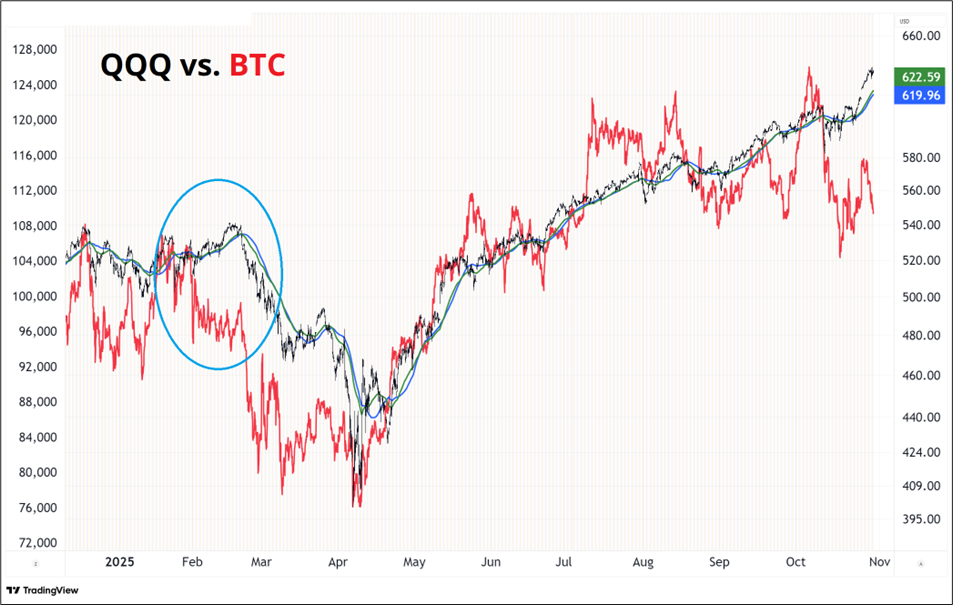 I mentioned the crypto thing, and you might recall this happened in February. Crypto turned lower while QQQ kept chugging. Crypto was the leader (see cyan oval).