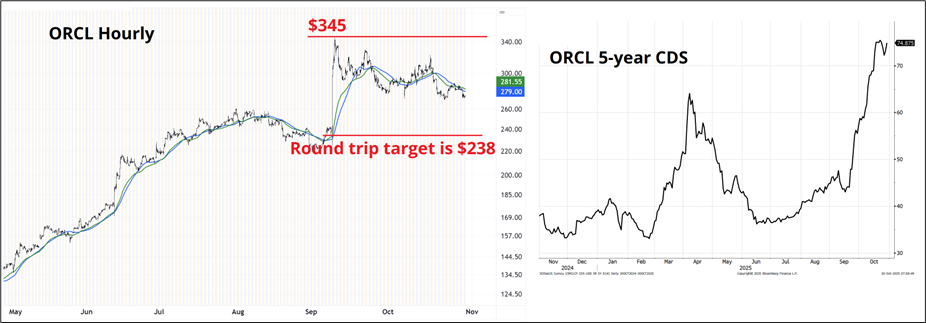 Common knowledge says that you want to be long during a bubble and that stocks only go up and you should buy every dip in the stock market, and this has been correct for 17 years, pretty much. But in the short run, there is a ton of weird stuff going on. The record-low breadth, weakness in crypto, poor response of META to moar capex, and a Fed that maybe isn’t on autopilot anymore all make me cautious, and I am selectively shorting the stocks that I think are least attractive or most overblown. ORCL (see rising CDS there, too), CRWV, and NVDA all look like fair candidates to take a shot from the short side over the next few weeks. ORCL specifically looks to me like it wants to make a round trip…