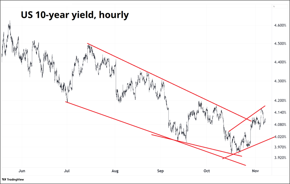 US 10-year yields were in a perfect narrowing and descending channel for more than five months as the market got comfortable with three more Fed cuts, but the top of that channel is now in jeopardy as Jay Powell attempted to introduce some optionality at the October 29 FOMC meeting.