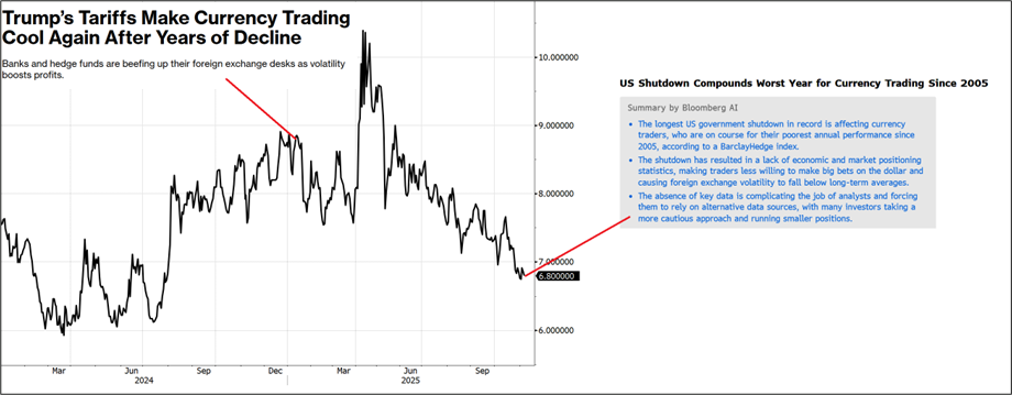 Interest rates have not been in play all that much as volatility in bond markets has cooled dramatically (similar to FX vol). The action has been in equities and precious metals in recent months with bonds and FX somewhat sidelined.
