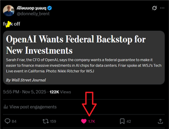 And the tremendous backlash to OpenAI’s CFO claiming that the US government should subsidize their borrowing because AI is strategic. It gives off the impression that the AI vision is so grandiose and expensive that the private sector can’t possibly handle it.