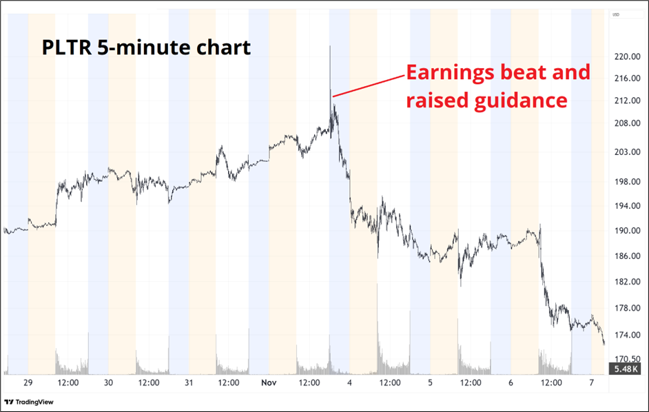 Damn unpretty for stocks as the momentum has been sucked out and the narrative has flipped from max MOMO/FOMO to skepticism. I went through a bunch of the chinks in the armor of the narrative earlier. Market reversals are often some combination of narrative exhaustion and endogenous reversal. A big red flag on the price action / microstructure side has been the post-earnings price action. I highlighted META earlier, and PLTR was the most crimson of flags as they beat and raised and the stock popped and flopped. Good news/bad price.