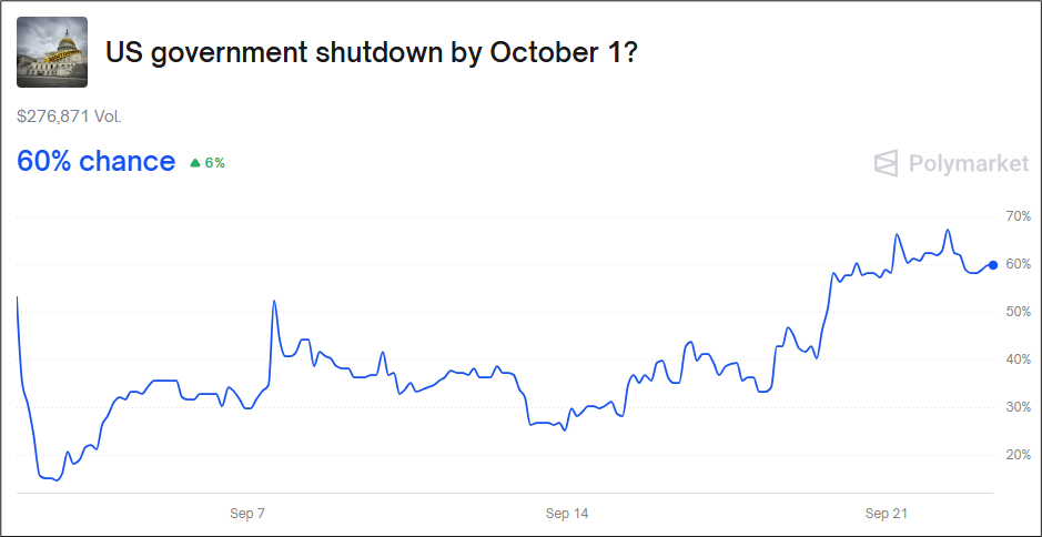 Government shutdown odds are rising as Republicans could only muster 44 of the 60 votes needed to pass a spending bill in the Senate last week. Two Republicans voted against the bill and eight Republicans were absent and thus did not vote.