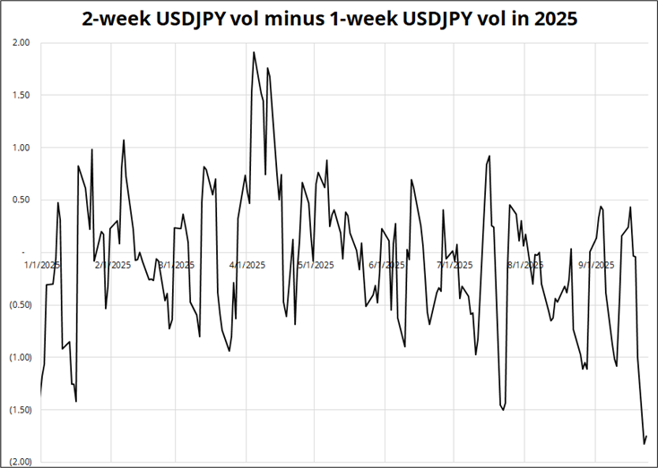 You could potentially short the 2-week vol, guessing that NFP will be cancelled, though you would still be exposed to weekend risk around the LDP election. Probably safer to just avoid being long, although I will say the market is getting bored of this LDP story somewhat. If Takaichi surprises, USDJPY will move higher on the open on Sunday October 5, but Koizumi is a boring and vol-negative outcome. So net-net, selling the 2-week makes sense.