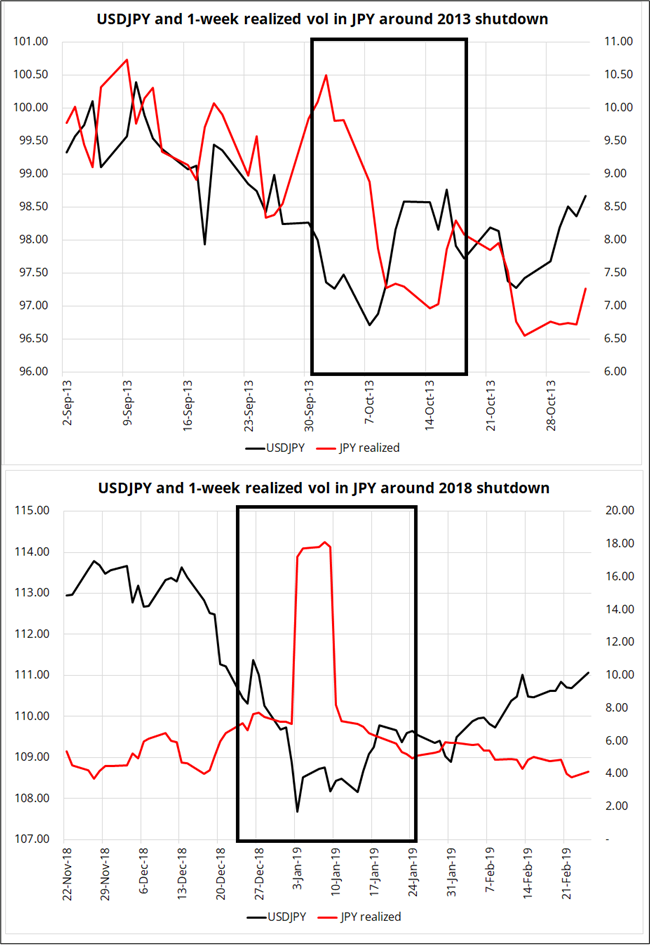 You can see USDJPY sold off into both shutdowns and rallied thereafter. Questions of fiscal drag arise but are waved off by the time the government reopens a few weeks later. Volatility falls as reopening appears likely.