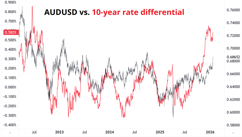 You can see in this next chart that Aussie vs. USA rate differentials exploded out of the range in late November 2025 and the currency is finally starting to catch up.