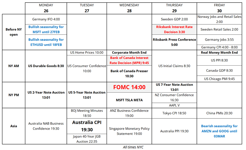 Owners of gamma should have plenty of opportunities to play Pong back and forth as we get some major earnings reports, big central bank meetings, three US bond auctions, corporate and real month end, and a bunch of other random stuff. Aussie CPI Tuesday should be strong and should take RBA hike pricing to 99%.