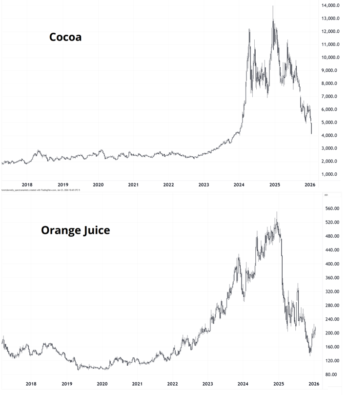 Note the two star commodities of 2024/2025 (OJ and Cocoa) have now collapsed. Never bet on Malthus in the long run. He is always wrong. Innovation always wins. That’s why the long-term charts of commodities tend to look more like charts of altcoins, not SPX.