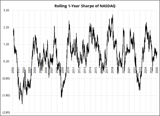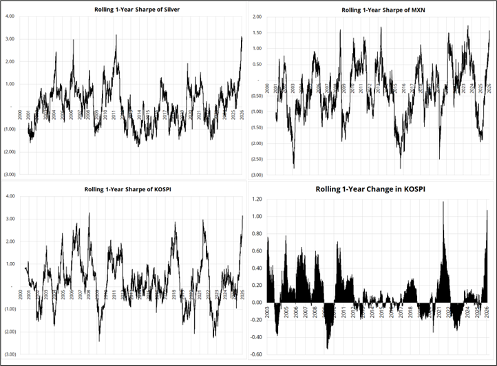 The charts above show three Sharpe ratios (XAG, MXN, KOSPI) and the 1-year rolling returns of the KOSPI. There are many, many assets throwing off Sharpes of 3+. Meanwhile, the NASDAQ, which was the epicenter of the TINA trade for years, is annualizing at a Sharpe of 0.61.