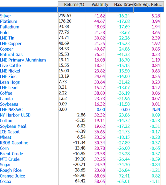 Check out the 1-year performance of commodities.