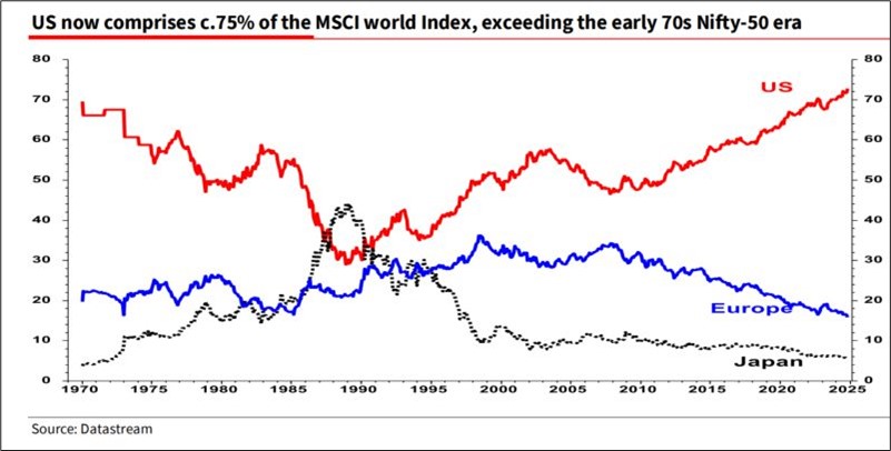 Most EU pension funds follow MSCI World for their equity allocations and there’s considerable reputational/career risk for anyone daring to go underweight USA. There was some discussion about how it’s kind of absurd that MSCI World is now 72% USA, but benchmarkers need to benchmark! Several European pension funds used to run GDP-weighted equity allocations, but after underperforming for so many years, they have all been stopped out and forced to run the MSCI World sized allocations. This forced herding is a big deal. It means 72% of all new money must go into US indexes. Sure, the US companies are super profitable, but they “only” represented 38% of global profits in 2024.