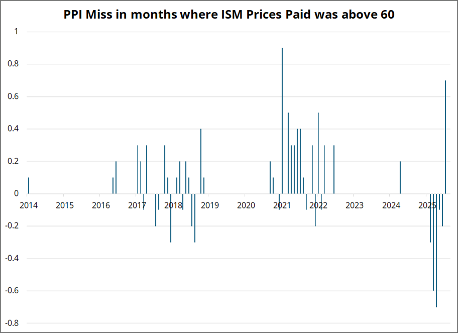 Finally, I was curious about what PPI does in months where ISM Prices Paid is above 60. Prices Paid is currently 63.7. The results are interesting only in that they seem to show a setup where recently Prices Paid was high, even as PPI kept missing early in the year, probably reflecting front-loading of imports creating an expectations vs. reality mismatch. If the snapback has begun, this would be a decent reason to lean towards a strong number tomorrow.