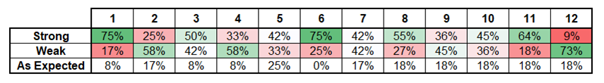Not a ton of seasonality in August, but it leans strong as you can see in the next table. The top row (1 through 12) is the month of the year. Look at that turn of the year effect in December and January ha.