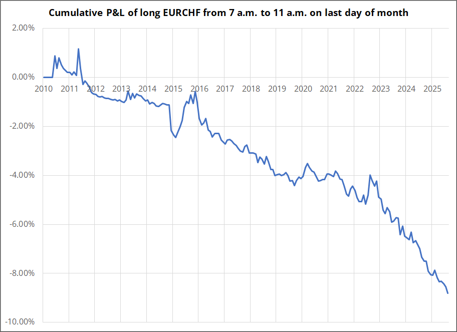 The EURCHF short is a few pips from getting stopped out, so I will leave that and presume I am about to get dinged. For your reference, here is the performance of EURCHF, 7 a.m. to 11 a.m. on the last day of every month. These results show all final days, with no filter for S&P or NASDAQ performance.
