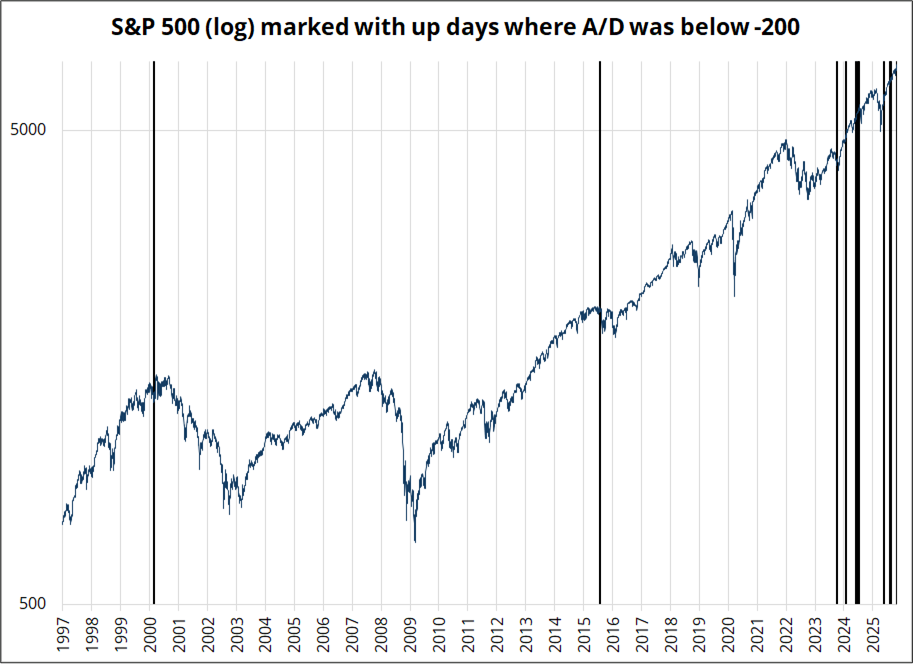 The advance/decline (A/D) line yesterday was -294. To give you a sense of the breadth situation, here are all the times you had a positive SPX day with A/D below -200.