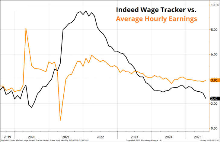 We wait patiently for Friday’s Jackson Hole speech. It would seem odd to me for a wait-and-see Fed Chair to telegraph an interest rate cut four weeks before a meeting when there are two major economic releases yet to drop (or three, as we are now going to watch PPI much more closely than usual after last week’s barnburner). In fact, I would think the risk is the other way: Powell uses Jackson Hole to explain that while demand for labor is falling (low headline NFP), labor supply is also falling just as fast (low unemployment rate) and therefore there is not necessarily an urgent need to cut rates. He can give a nod to the dovish camp by simply saying that if labor market data confirm the weakness seen in recent months, a rate cut makes sense.