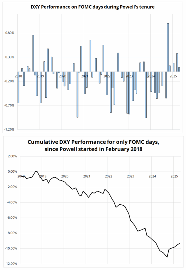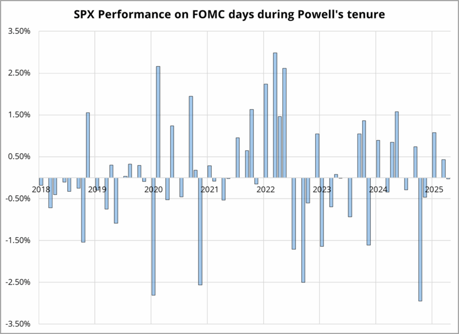 S&P performance has been more mixed. You can see that during the downtrend in 2022, the market squeezed on FOMC day, but during the up trends of 2020, 2021, 2023, 2024, and 2025, FOMC days were a coin toss for the S&P.
