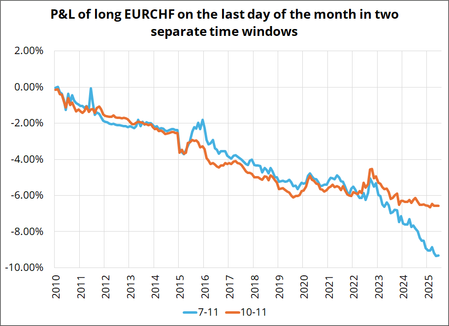 If, for some crazy reason, you want to be long EURCHF… Going long at 11 a.m. on the last business day of the month is the play as the selling often burns itself out then and the first day of the month mean reverts.