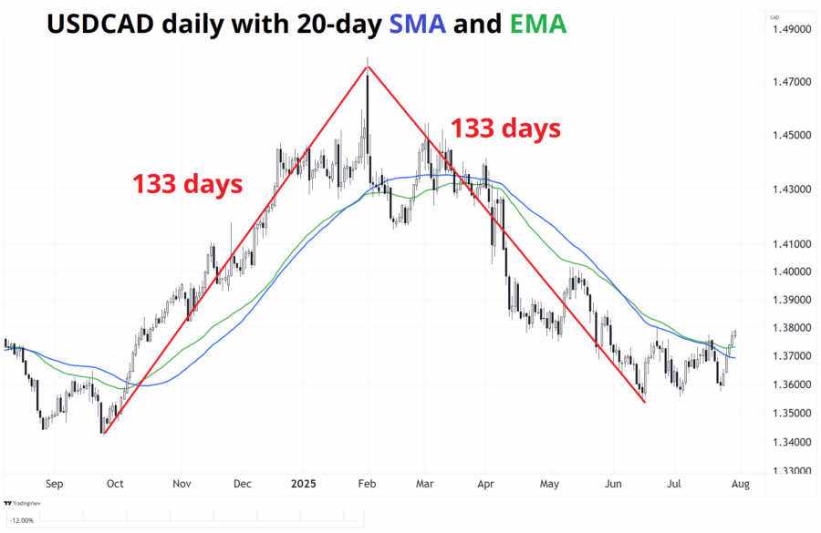 USDCAD has completed a perfectly-symmetrical hat-shaped move as it rallied for 133 days then sold off for 133 days and is now above the 20-day MAs for the first time since just before Liberation Day.