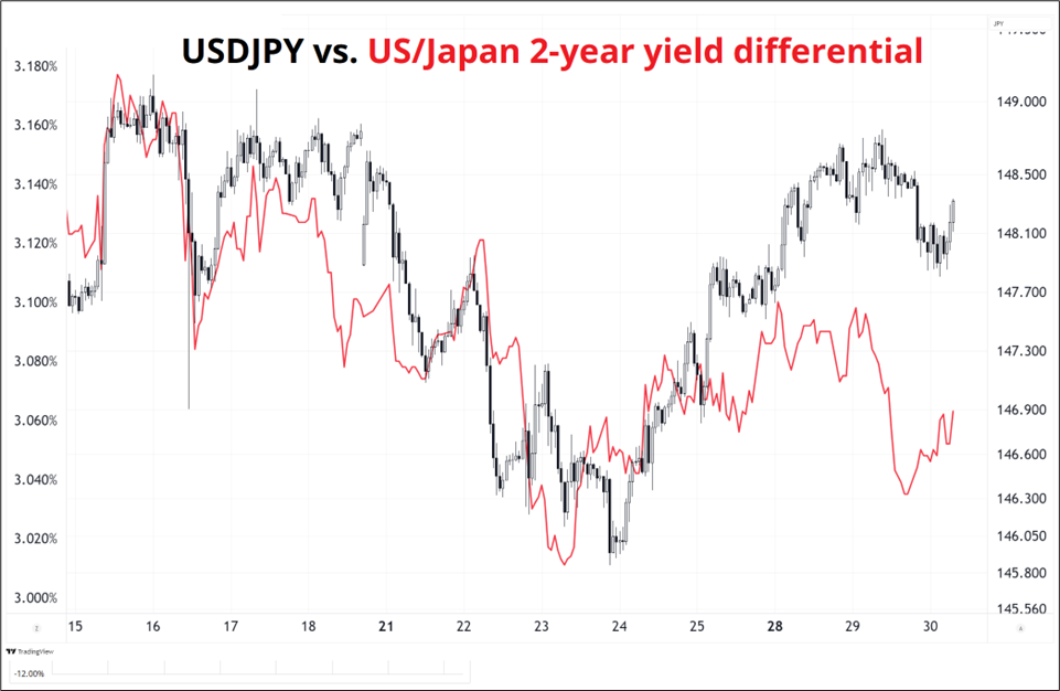 My bullish USDJPY view got off to a rough start as yields dumped yesterday on the back of short covering into QRA and FOMC. USDJPY is mostly back to following interest rate differentials, though you can see here that the USD is a bit stronger than you might think it should be if you just overlay rate diffs and USDJPY over the past two weeks.