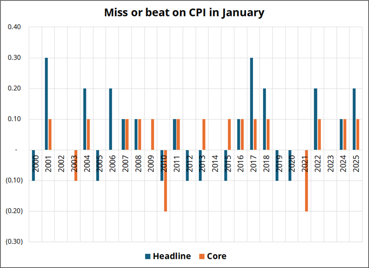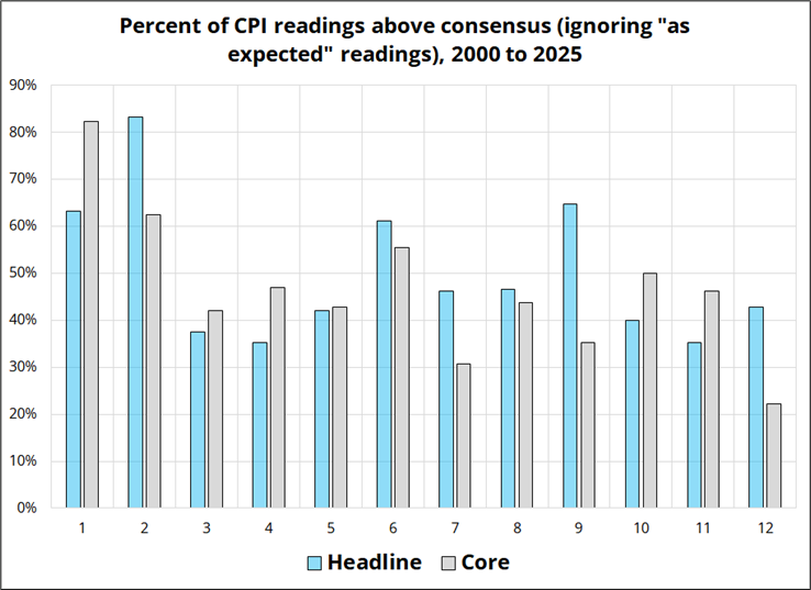 While I don’t have a view on jobs, it’s worth remembering that economists are unreasonably bad at measuring January inflation for some reason. Prices reset for many products on January 1 and therefore in times of abnormally-high inflation, you should expect January to come in stronger than other months. You would think this would easily be captured in economist models, but it’s not. Two charts: