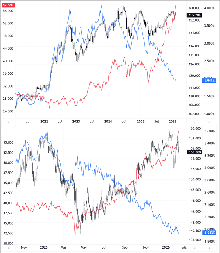 In summary: Takaichi has stabilized markets for now and that’s why USDJPY is at 155.00. But it doesn’t mean we need to go much lower. To be long JPY, you need to believe that the correlation to Nikkei will break and it becomes an unhedged BUY JAPAN trade. That’s possible. I just think the jury’s still out.