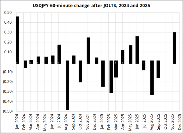 And finally, here are market reactions in USDJPY over the past 2 years (1-hour USDJPY price change after JOLTS, in percent).