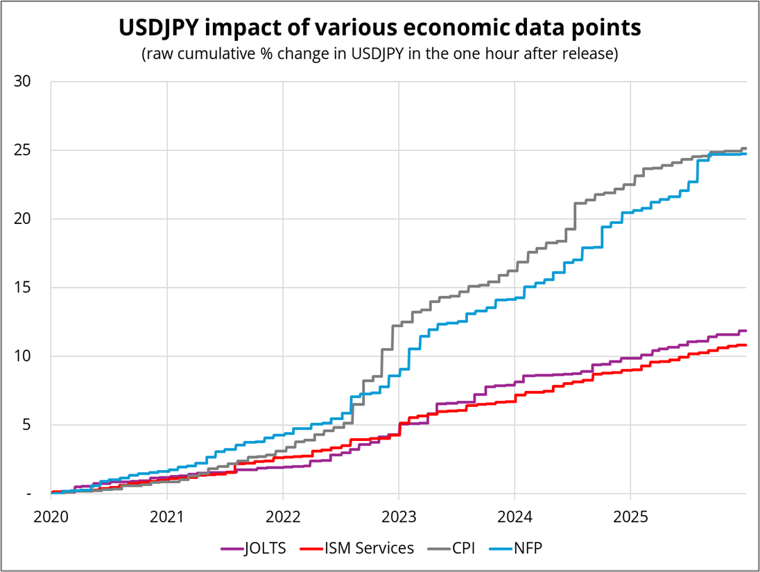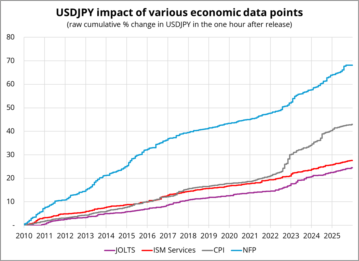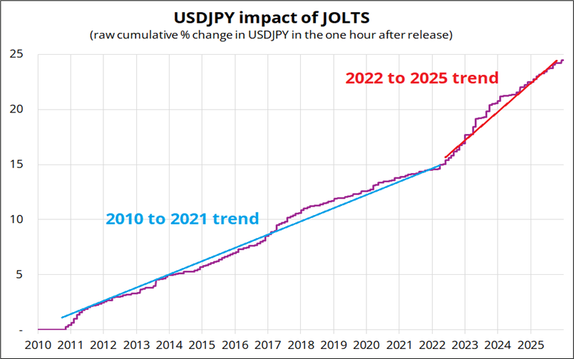 The y-axis is total percent movement in USDJPY in the one hour following each economic data release in the given time frame. You can see that JOLTS has moved USDJPY a tad more than ISM in recent years. That’s partly an indictment of ISM—survey data has been a red herring for years and people finally started realizing that in 2023/2024, but it’s also a sign that people do trade the JOLTS release.