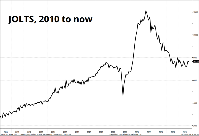 Also, note that I chopped 2020 to 2023 out of the data because the size of the JOLTS numbers and misses during COVID blows up the rest of the sample and I think it’s safe to say that we are not in that sort of labor shortage / supply shock regime. We are in a standard regime more like 2011-2019 or 2024/2025. A simple glance at the first chart above (back to zigging and jiggly vs. the explosive moves during COVID) tells me we are in a normal regime, not a supply shock regime. The two are easy to differentiate. Still, it’s an important assumption, even if it’s an easy and safe one to make, so I’m letting you know.