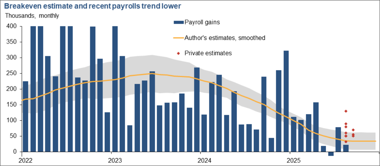 The reasoning here is that 2020/2022 was a once-in-a-lifetime overheated labor market and thus any downward momentum off that froth is natural and thus we need to look at today’s labor market in the context of what it looked like before the overheating episode. I did not look at NFP because, as explained by the Dallas Fed, the current period is not comparable to the pre-COVID period as demographics and supply shocks have dropped current breakevens to 30,000 jobs vs. a range of 100,000 to 250,000 beforehand.