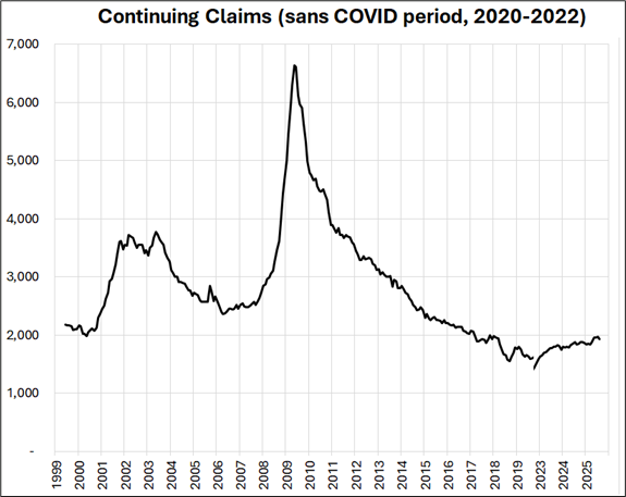 And here are Initial and Continuing Claims. Both show a labor market humming along at 2017/2019 levels.