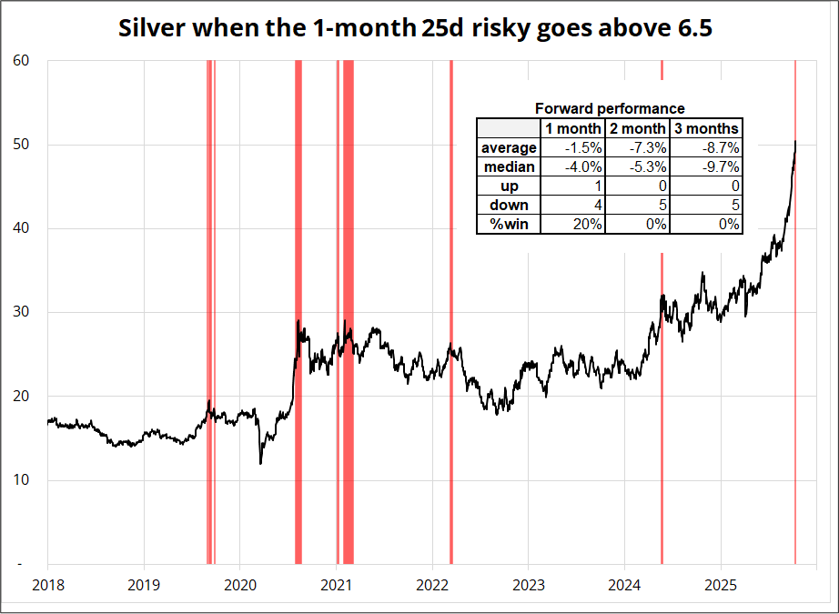 The spikes are mean reverting and seem to be an okay signal of topside market panic. The sample of spikes is only five non-overlapping signals since 2018 (the risky was much lower pre-2018), but all five times silver was lower two and three months later. Here are the times it happened, marked in red, and the forward performance.