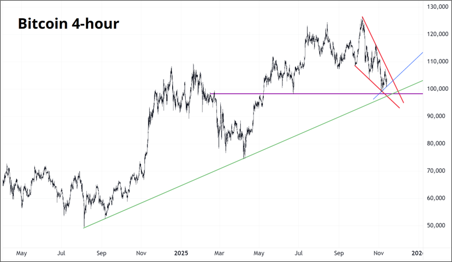 I am trying to show a few time frames here at once, hence the different colors. The trendline from August 2024 comes in around 99000 (green). The key pivot through 2025 has been 98400/99000 (purple line). The red triangle marks a narrowing wedge which breaks through either 98000 below or 107000 above. And finally, the thin blue line is a micro trendline around 101000. It all says to me that if we go below 98000, I’m cooked. In the meantime, I hope to survive the random chop in both stocks and crypto before a resolution higher. My dream is that I survive and hold these positions for a few weeks as the now-getting-louder AI bears capitulate into year end.