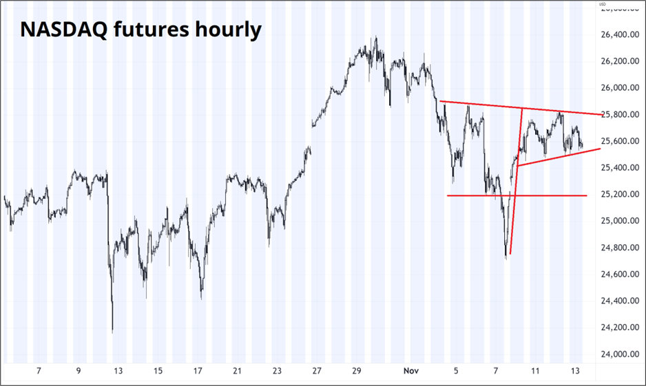 For the NASDAQ, here’s what I see. There’s a bull flag that says we shouldn’t go below 25400 and then you have the Friday gap through 25200. Below 25150 in NQ and I will seriously reconsider my bullish stance. A topside break of 25900 is super bullish and argues for a new ATH.