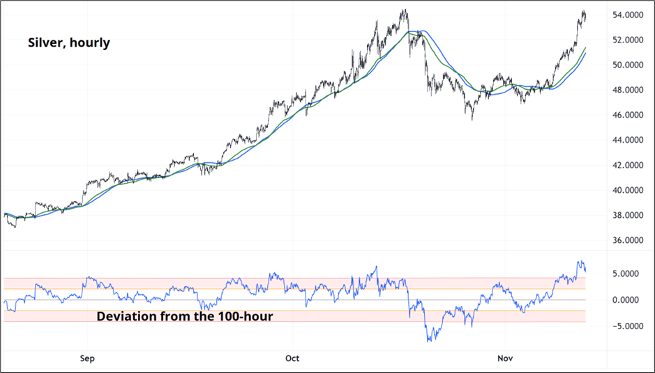 Silver is going nuts again and narrowly exceeded the all-time high touched in October. Measuring its deviation from the 100-hour moving average it’s now more overbought than it was at that point.